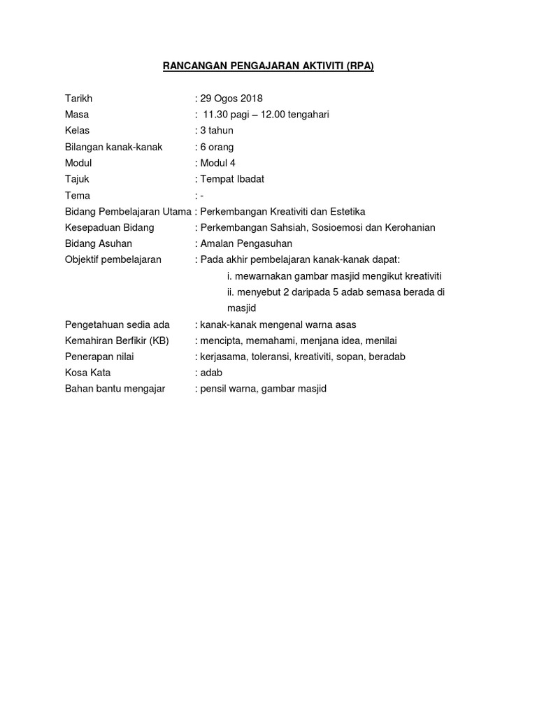 Rpa Perkembangan Holistik Docx Rancangan Pelaksanaan Aktiviti Nama Pendidik Noor Aina Binti Yaziz No Kad Pengenalan 020216 08 0010 Masa 30 Course Hero