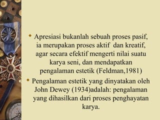 APRESIASI SENI BUDAYA KARYA SENI DUA DIMENSI DAN TIGA DIMENSI Oleh. Loudness Pitch Beat Repetition Melody Pattern dan Noise. Jadi apresiasi adalah proses pengenalan nilai- nilai seni untuk menghargai dan menafsirkan makna arti yang terkandung di dalamnya.