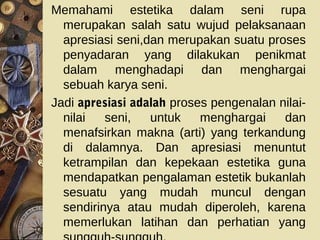 Memahami estetika dalam seni rupa merupakan salah satu wujud pelaksanaan apresiasi senidan merupakan suatu proses penyadaran yang dilakukan penikmat dalam menghadapi dan menghargai sebuah karya seni. Pandangan umum nilai keindahan di Indonesia terhadap karya desain yang hanya sebatas selera dan subyektifitas perlu untuk diperbaiki dengan landasan teoritis yang baik. Estetika visual memiliki elemen kunci ini.
