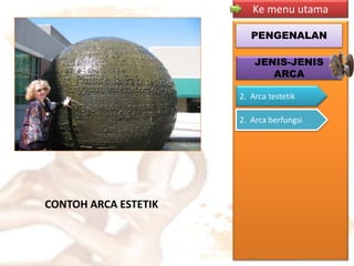 PENGENALAN KREATIVITI PENGENALAN KREATIVITI ESTETIKAESTETIKA Fokus kepada sifat kreatif dan ekspresifFokus kepada sifat kreatif dan ekspresif. Arca terbahagi kepada dua jenis iaitu arca berfungsi dan arca estetika. Isi kandungan 1 Etimologi 2 Penilaian keindahan.