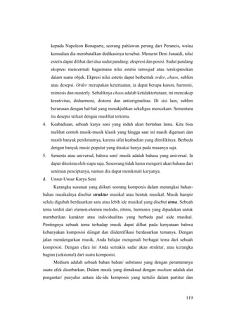 Narasi dan teks merupakan bagian yang penting di sini misalnya dalam tembang macapat. Musik merupakan seni yang timbul dari perasaan atau pikiran manusia sebagai pengungkapan ekspresi diri yang diolah dari suatu nada-nada atau suara-suara yang diatur dengan irama atau hitungan dan mengandung unsur. Pengertian estetika adalah suatu bidang ilmu yang mempelajari dan membahas tentang keindahan bagaimana suatu keindahan dapat terbentuk serta bagaimana keindahan tersebut bisa disadari dan dirasakan oleh manusia.