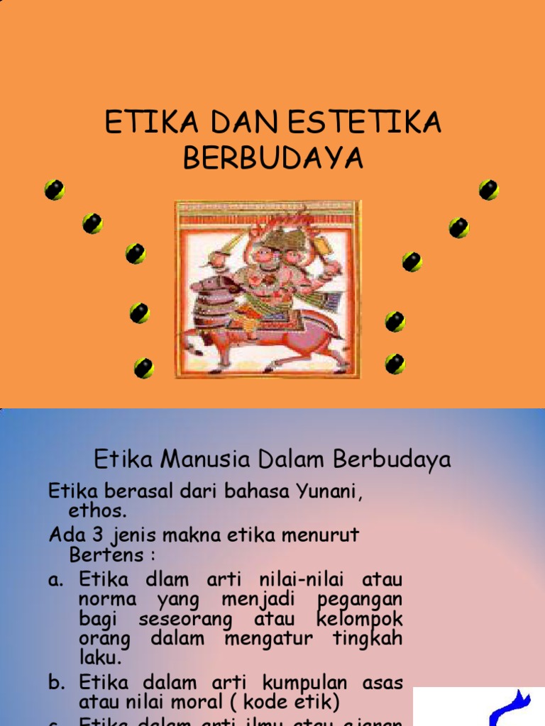 Etika bisa disamakan artinya dengan moral mores dalam bahasa latin akhlak atau kesusilaan. Sesuatu yang estetika berarti memenuhi bentuk keindahan secara estetik murni maupun sempit baik dalam bentuk kata warna garis ataupun nadaBudaya yang estetik berarti budaya itu meliputi keindahan. Etika dlam arti nilai-nilai atau norma yang menjadi pegangan bagi seseorang atau kelompok orang dalm mengatur tingkah laku.
