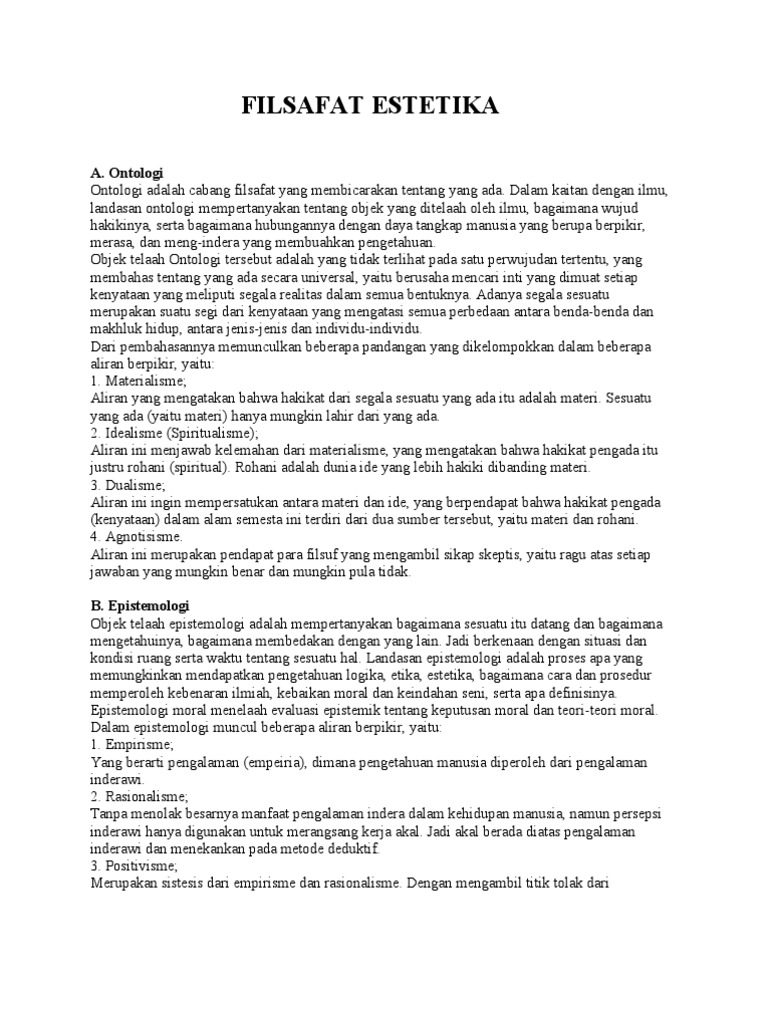 Apa itu Filsafat Esteika1 Estetika adalah cabang ilmu yang membahas ttg keindahan yaitu bagaimana keindahan itu dapat tercipta dan bagaimana orang bisa merasakannya dan memberi penilaian terhadap keindahan tersebut. Bagi Friedrich Schiller 1759 - 1805 apresiasi estetik keindahan adalah rekonsiliasi paling. Filsafat Seni dan Estetika.