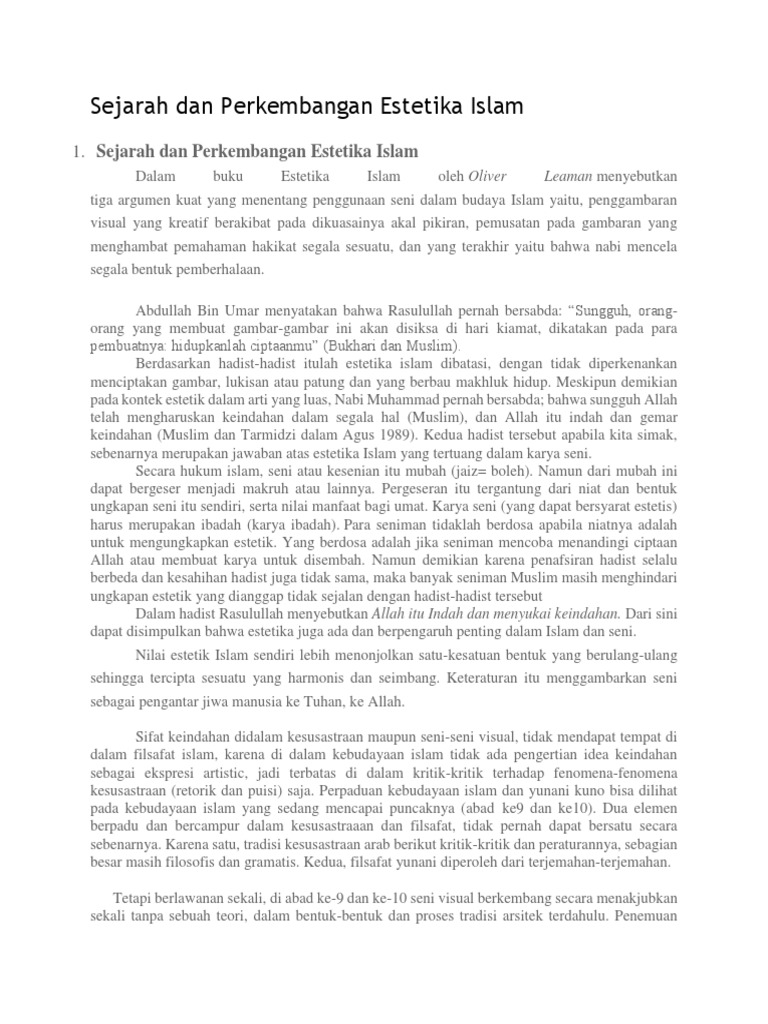 PENDAHULUAN Posisi estetika tak berbeda dari. Kesenian sebagai suatu aspek kehidupan tunduk kepada syariat Allah SWT seni yang tidak membawa mudarat atau kerusakan merupakan hal yang diharuskan yang mungkin memudaratkan atau merusakkan dimakruhkan dan yang pasti membawa mudarat atau kerusakan adalah diharamkan. Keindahan erat sekali hubungannya dengan lidah dan selera perasaan.
