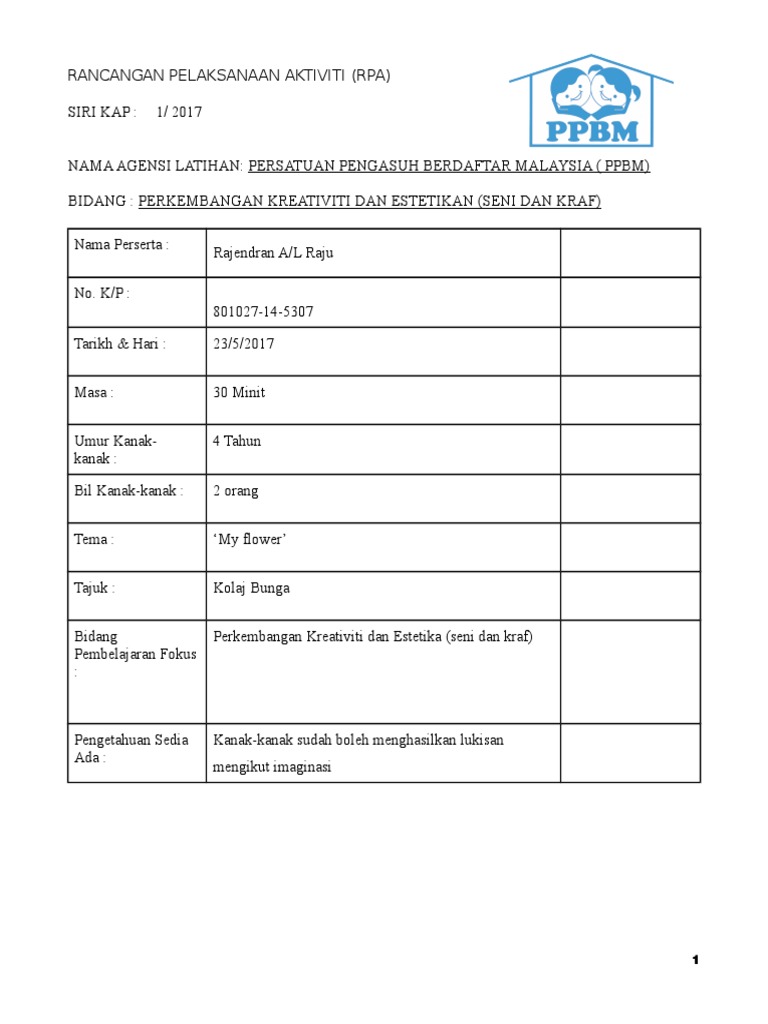 Rpa Perkembangan Holistik Docx Rancangan Pelaksanaan Aktiviti Nama Pendidik Noor Aina Binti Yaziz No Kad Pengenalan 020216 08 0010 Masa 30 Course Hero