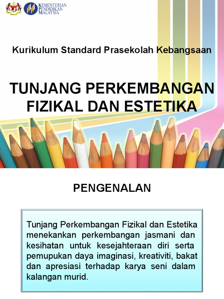 Tunjang Perkembangan Fizikal dan Estetika merangkumi Perkembangan Fizikal dan Penjagaan Kesihatan serta Perkembangan Kreativiti. Pendidikan prasekolah menyediakan peluang pembelajaran untuk. Selepas mengikuti aktiviti-aktiviti yang berteraskan Tunjang Fizikal dan Estetika secara khasnya komponen Perkembangan Kreativiti murid mempunyai pengetahuan dan kemahiran tentang bahan dan teknik dalam penghasilan karya seni berkebolehan menghasilkan karya kreatif secara bersendirian dan juga secara kumpulan serta berkebolehan untuk apresiasi seni.