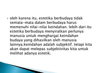 Ia merupakan subdisiplin atau cabang falsafah iaitu aksiologi cabang ini sering dikaitkan dengan falsafah seni. Pengertian estetika ialah suatu keadaan yang berhubungan dengan sensasi keindahan yang baru bisa dirasakan seseorang jika terjalin perpaduan yang harmonis antar elemen yang ada dalam suatu objek. Bentuk terikat pada isi yang berupa material dan kegunaan praktis tetapi.