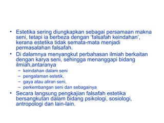 Estetika juga dianggap sebagai cabang ilmu filsafat yang membahas tentang keindahan yang didalamnya ada seni dan alam semesta. Dalam tradisi Islam estetika dikaitkan dengan metafisika atau ontologi pengetahuan dan pemahaman tentang wujud dan peringkat-peringkatnya dari yang zahir sampai ke yang batin. Dalam Rahman 2013 estetika dalam seni Islam tidak Rahman 2013 bahwa potensi kerohanian dapat dicapai melalui penggambaran manusia dalam suatu karya seni visual sangatlah utama dan alam.
