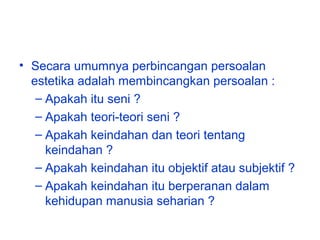Menyentuh aspek keindahan yang terdapat pada sesebuah karya seni. Yang enggan untuk semata mata menjadi pelayan bagi sensasi indrawi. Terjadinya bаnуаk реmbunuhаn 3.